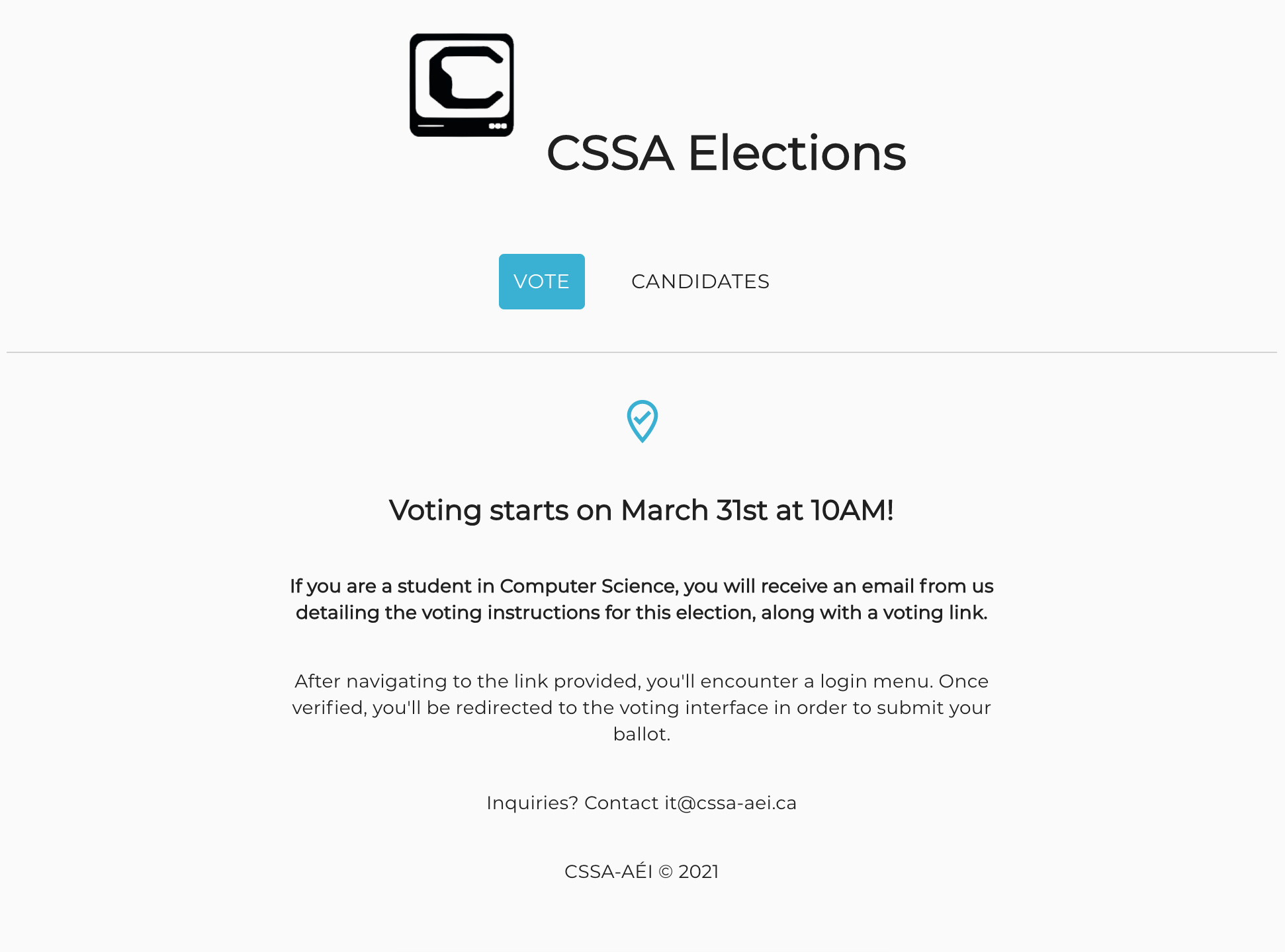From March 31st to April 3rd 2021, the Computer Science Student Association (CSSA) hosted its executive elections for the second time online. This year, we decided to build our own bilingual voting platform, as opposed to outsourcing this service to ElectionRunner again.